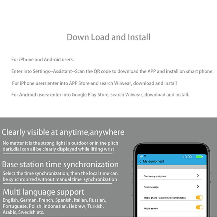 Support Pedometer, Message Reminder, Call Reminder, Push Message, Calories Burned, Bluetooth, Heart Rate Detection, SIM Card, Contacts, Remote Capture, WiFi, Alarm, Time & Date