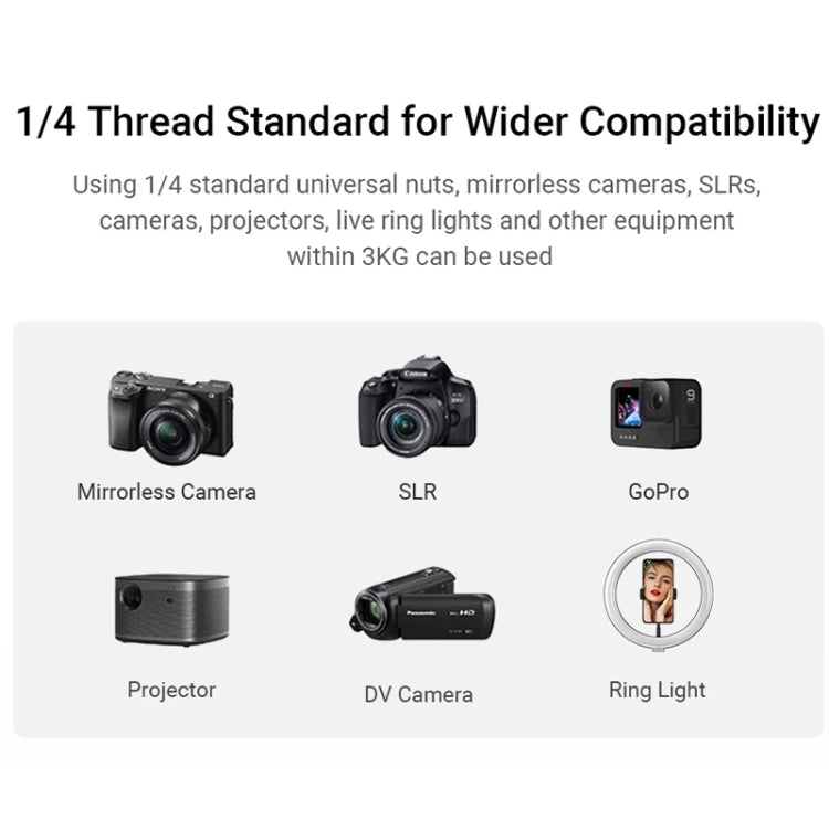 7. Adjustable Tripod: Features 3-stage telescopic legs with a central column lift adjustment, offering height flexibility from 40cm to 137cm.