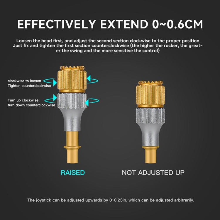 3. Effectively extend 0-0.6cm, loosen the head first, adjust the second part clockwise to a suitable position, then fix and tighten the first part counterclockwise (the higher the rocker, the greater the swing range, more sensitive controls)
