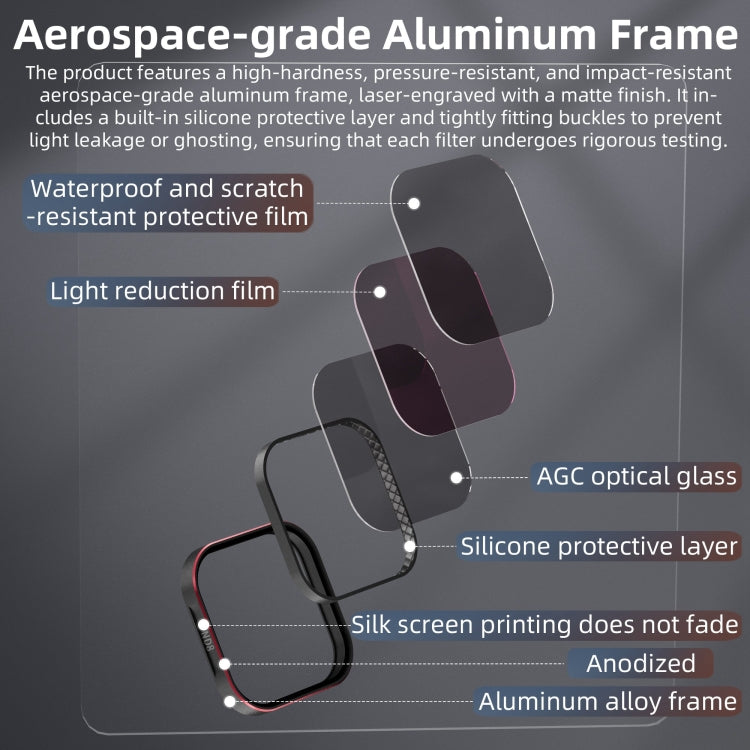 3. The aviation-grade aluminum frame is laser engraved with a matte black finish to prevent light leakage or ghosting, ensuring that each filter has been rigorously tested; lightweight design, no burden on shooting.